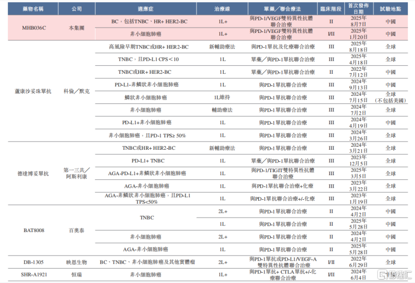 下表呈现针对乳腺癌或非小细胞肺癌之TROP-2 ADC管线组合与PD-(L)1联合治疗的全球竞争格局。