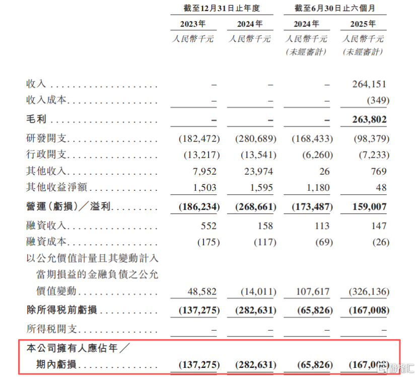 2023年、2024、2025年1-6月(报告期),公司的收入分别为0、0、2.64亿元,分别录得净亏损1.37亿元、2.83亿元、1.67亿元,两年半累计亏损5.87亿元。