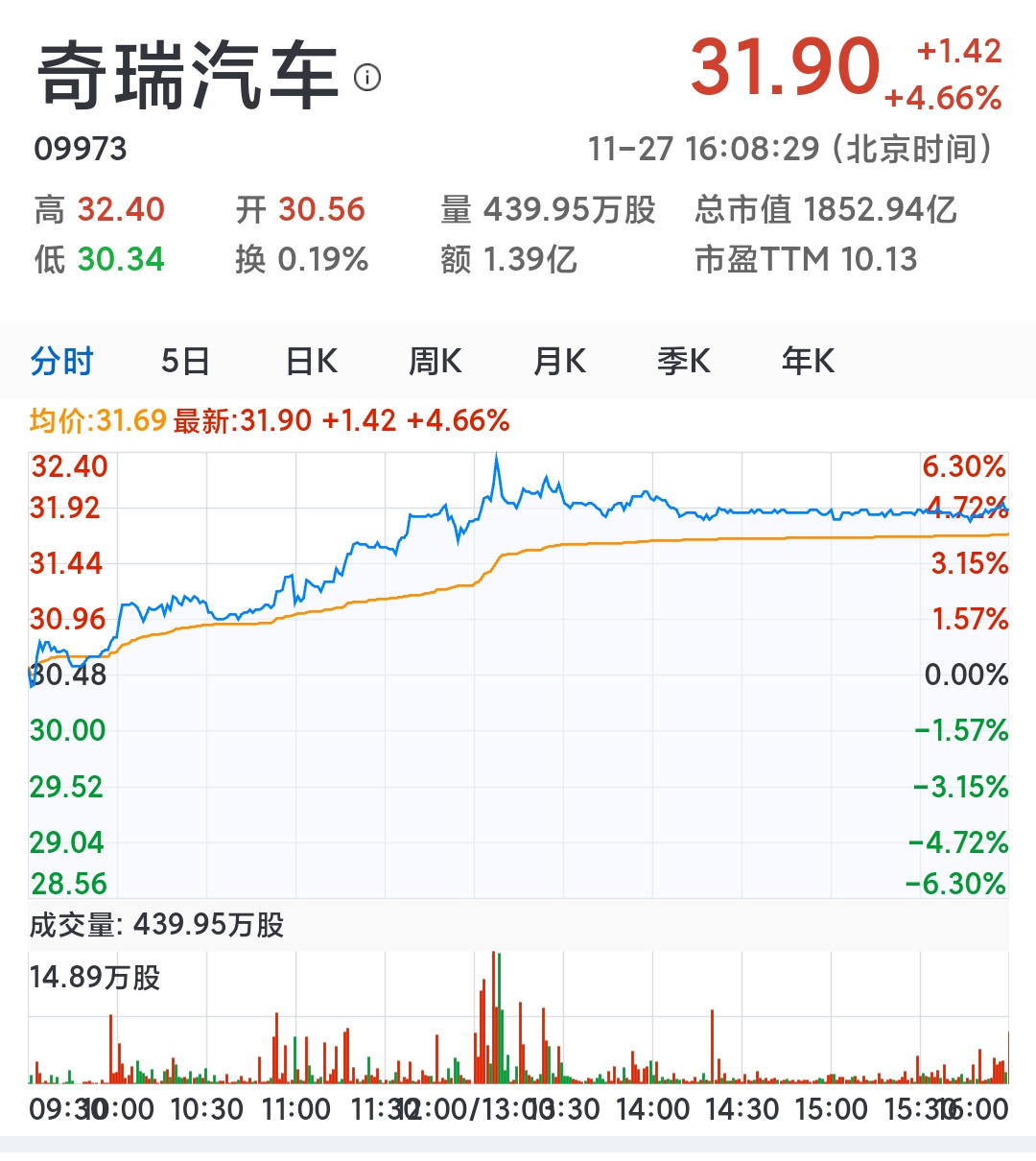 11月27日,奇瑞汽车(9973.HK)股价大涨。截至港股收盘,奇瑞汽车股价报收31.900港元,上涨4.66%,涨幅1.420港元,总市值达1853亿港元。资本市场也看好奇瑞汽车,中泰证券首次覆盖,给出“买入”评级。