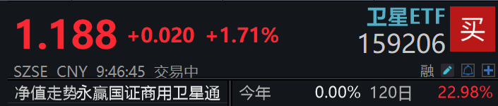 今日开盘,卫星ETF(159206)上涨1.71%。成分股乾照光电(300102)、普天科技(002544)涨停,亚光科技(300123),航天宏图(688066)等个股跟涨。