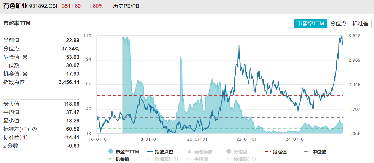 从板块估值来看,中证有色金属矿业指数最新估值22.99倍PE-TTM,位于37%历史分位数,年内估值扩张约24%,显示指数涨幅主要由盈利驱动而非估值扩张,同样印证了板块基本面的高增长。