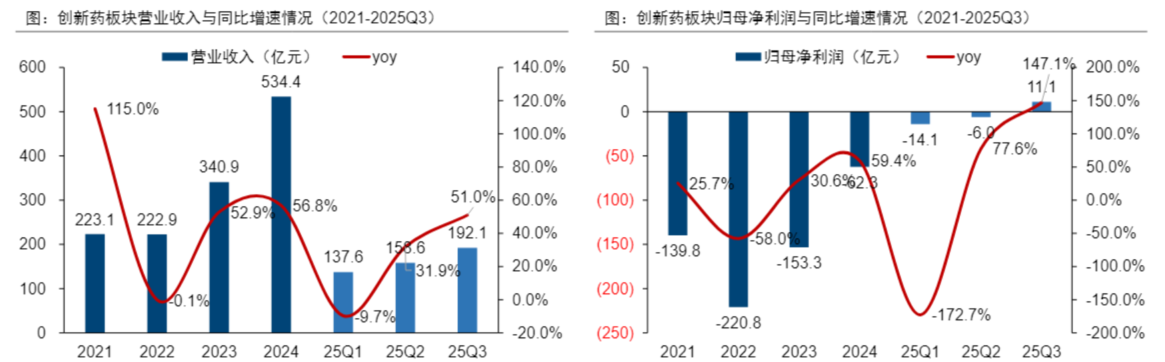 业绩面看,创新药营收迅速增长,利润端扭亏为盈。2025年前三季度,创新药板块上市公司实现营业收入488.3亿元( 22%),归母净利润-4.6亿元( 71%)。2025Q3实现营业收入192亿元( 51%),归母净利润11亿元( 147%)。
