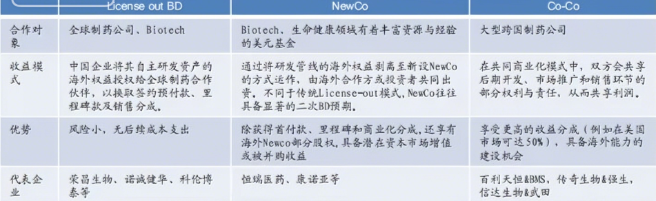 在创新药领域,BD是指商务拓展,旨在通过资源整合、风险分担和利益共享,加速药物研发和推动创新药的全球商业化。BD模式包括对外授权(License-out),即将药物的后期研发和上市销售权授权给其他公司,还包括NewCo、Co-Co等。