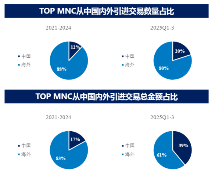 从受让方来看,不乏TOP MNC(跨国药企)的身影。2025Q1~Q3TOP MNC从中国引进交易数量占全球总数量20%;从中国引进交易总金额占全球总金额比达到39%,近四成付款流向中国企业。这一切的背后,是什么在催化?