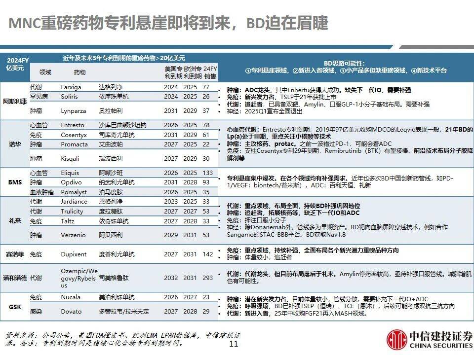MNC的专利悬崖催生出了大批BD需求,新革命性产品的BD授权大有可为。专利悬崖问题自2020年开始显现,因此看到MNC在肿瘤、自免、内分泌、呼吸等药王辈出的赛道进行持续BD和并购。当前,各BD赛道仍大有可为,除了pd1vegf外,在小核酸、口服glp1、egfradc、pd3/4等已经有先例的赛道上还没有看到饱和的趋势,出价和并购金额仍然非常火热。