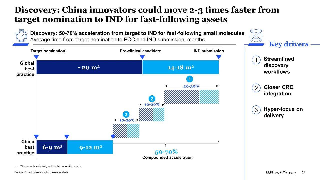 数据上看,在确定靶点到申请IND的药物发现阶段,中国创新药企可以以比国际同行快2~3倍的速度推进,在fast-follow型小分子药物上甚至可以实现50%~70%的复合加速,成本仅为全球最佳实践的1/3~1/2。