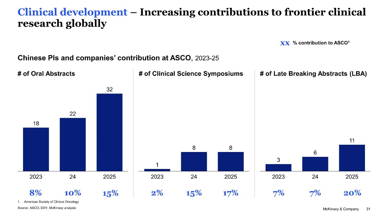 中国在临床开发上的优势,也使得“中国声音”涌现在全球前沿临床研究中。以全球肿瘤学领域规模最大、最具影响力的学术盛会ASCO为例,2023年至2025年,中国创新药企在口头报告、LBA和研讨会中的表现都在显著提升。
