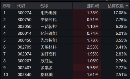 电池50ETF(159796)标的指数成分股多数冲高,电池正极材料龙头湖南裕能涨超10%,鹏辉能源涨超8%,多氟多涨超5%,天赐材料涨超2%,阳光电源、三花智控等涨超1%,宁德时代、亿纬锂能等涨幅居前。