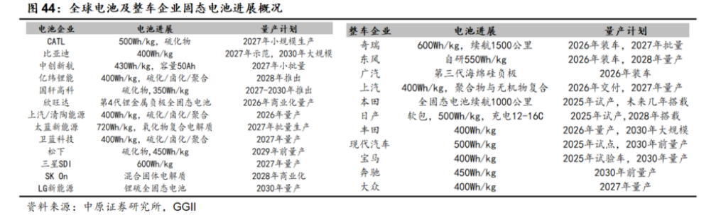 中原证券表示,从电池和整车企业布局来看,固态电池行业已形成明确的时间推进蓝图,为产业链各环节提供了明确的目标导向。在电池企业端,宁德时代、中创新航、亿纬锂能等头部厂商均将2027年定为全固态电池小批量装车的关键节点,目前已同步推进中试线产能爬坡与车规级样品验证。后续重点关注电池、整车企业相关技术进展,以及工信部2024年启动的固态电池重大研发专项中期审查进展。2025年11月11日,工信部发布《关于进一步加快制造业中试平台体系化布局和高水平建设的通知》,明确将固态电池及其关键材料技术列为重点方向,核心目标:解决固态电池从实验室到工厂的转化难题,如固态电解质稳定制备;联合上下游资源,形成从材料到电芯的完整中试能力;同时加速商业化,通过测试验证和工艺改进缩短研发周期,推动2027年前实现技术产业化。