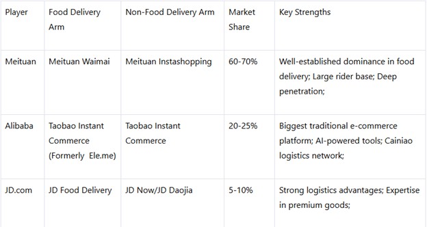美团凭借约700万骑手规模、业内最成熟的30分钟送达算法以及对小商户的深度覆盖仍具结构性优势,但阿里巴巴和京东正迅速缩小差距。