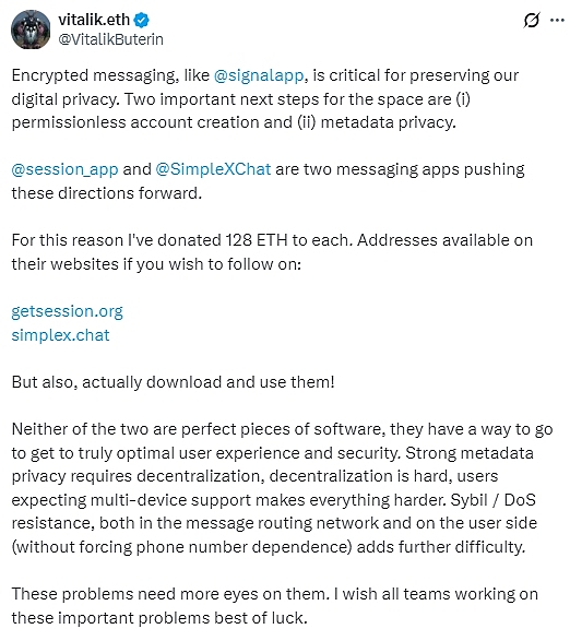2025年11月27日,Vitalik在X上发文,力挺两个去中心化消息应用 Session 和 SimpleX Chat,并分别向它们捐赠了 128 个 ETH。