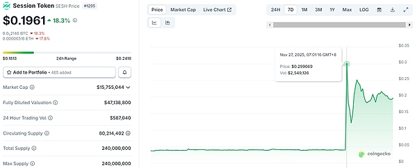 Session 还发行了代币 SESH,据CoinGecko 数据显示,该代币受Vitalik X推文影响,最高涨至将近0.3美元的高点,截至发稿回落至0.1961美元。