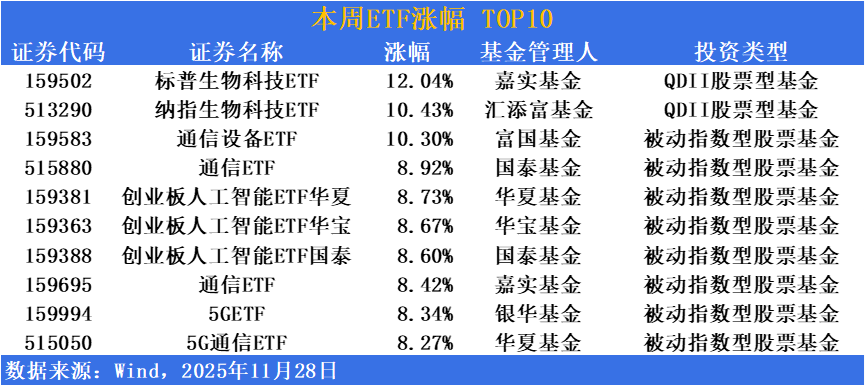 近期,随着海外流动性有望修复、国内年底提前博弈政策,前期交易风险逐步消化年内热门交易主题全线回暖,锂矿、光模块、银行主题相对抗跌,机器人、银行、非银主题成交活跃度提升显著。包括医药、通信、人工智能等关ETF开启反攻。涨幅前十的ETF均涉及成长赛道。标普生物科技ETF(159502)、纳指生物科技ETF(513290)等多支产品涨幅超10%;港通信ETF(515880)、创业板人工智能ETF华夏(159381)等多支产品涨幅超8%。