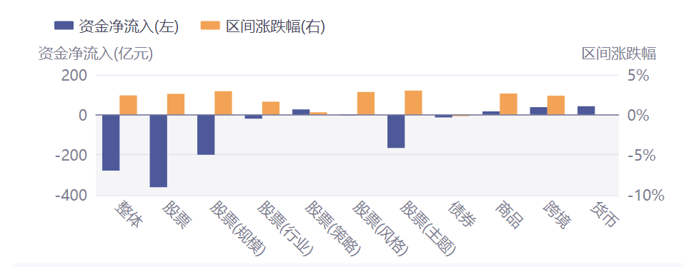 本期(2025年11月24日-11月27日),整体而言,投资者的兴致不高,错过卖点的投资者因反弹而再度观望,期待市场显著回调再增加权益配置的投资者,则普遍认为当前回调幅度吸引力不够。从数据上看,本期资金净遭遇流出279.76亿元。其中,货币型ETF,跨境型ETF,商品型ETF净流入居前。股票型ETF本期净流出-362.95亿元。