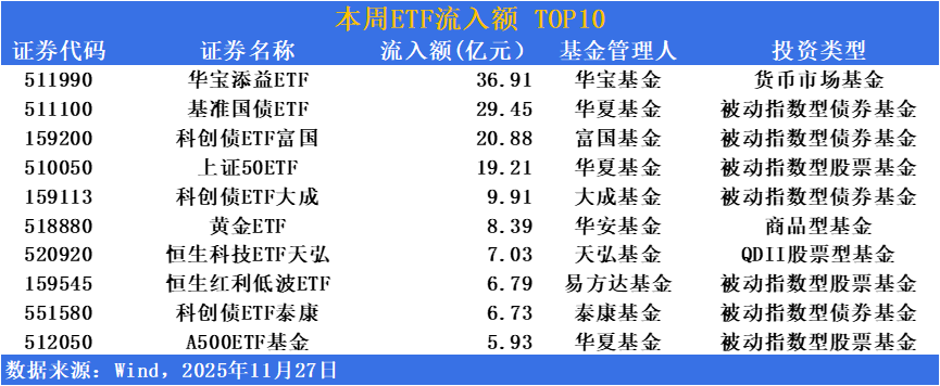 本期(2025年11月24日-11月27日),经济数据改善的同时,债市依然延续着弱势震荡格局。这也正体现了经济转暖下债市走弱的相关性。那么,接下来的债券资产配置价值如何研判是关键。至少从上周来看,纯债基金的业绩又一次出现了滑坡,意味着前期回流的避险资金或已经切出固收市场。华宝添益ETF(511990)流入超35亿,位居流入榜第一。基准国债ETF(511100)流入近30亿、科创债ETF富国(513750)流入超20亿,位居二、三。