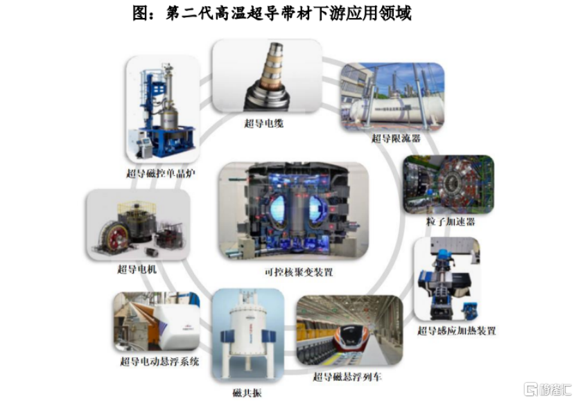 第二代高温超导带材能够带来显著的节能增效优势,并解决原有导体材料无法解决的工程问题,近年来已经应用于可控核聚变、超导电力、超导磁控单晶炉、超导感应加热装置等下游领域,并逐步向超导电机、超导磁悬浮列车、磁共振设备等领域渗透。