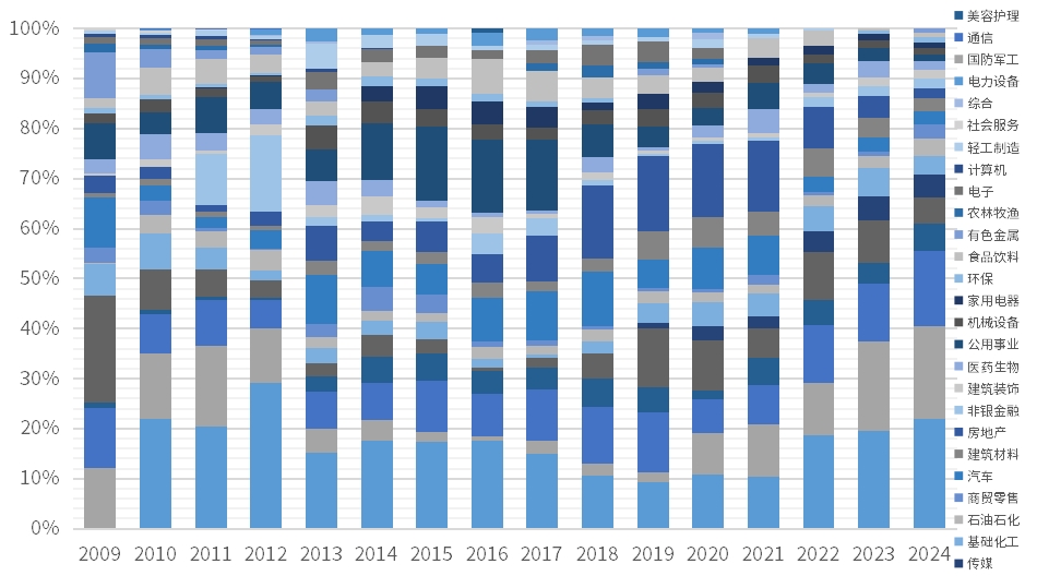 银行板块:如今占23%权重,但在2009年时几乎为零;2019年时权重不足10%