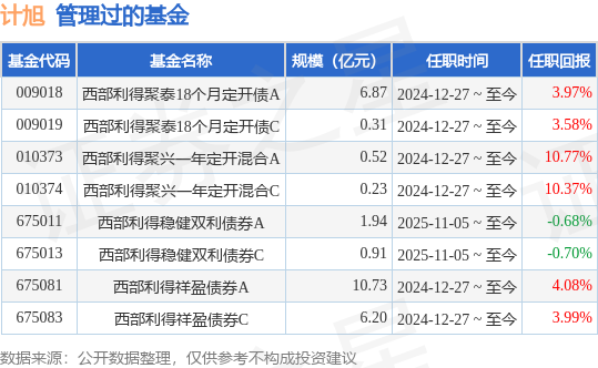 计旭先生:中国国籍,硕士毕业于外交学院世界经济专业。2016年7月至2018年4月任中债资信评估有限责任公司信用分析师,2018年4月至2019年7月任华宝基金管理有限公司信用风险分析师。2019年8月加入西部利得基金管理有限公司,曾任研究员、基金经理助理,现任基金经理。具有基金从业资格。现任西部利得聚泰18个月定期开放债券型证券投资基金基金经理助理。2024年12月27日担任西部利得聚兴一年定期开放混合型证券投资基金基金经理、西部利得祥盈债券型证券投资基金基金经理、西部利得聚泰18个月定期开放债券型证券投资基金基金经理。2025年11月5日起任西部利得稳健双利债券型证券投资基金基金经理。