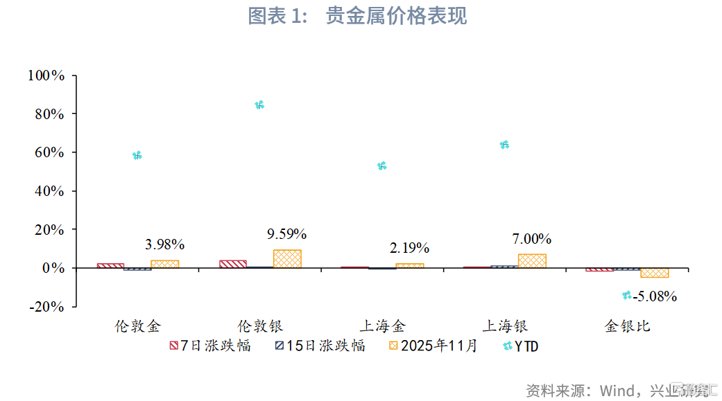 截至11月26日,相较于10月底,伦敦金上涨3.98%,伦敦银上涨9.59%,上海金上涨2.19%,上海银上涨7.00%,金银比下跌5.08%。