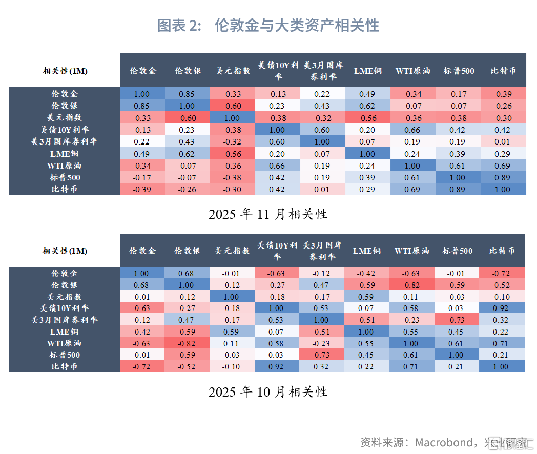 在过去的一个月中,黄金与白银正相关性增强,与美元指数负相关性增强,与美债收益率保持负相关性有所下降,与铜转为正相关,与比特币负相关性有所减弱。