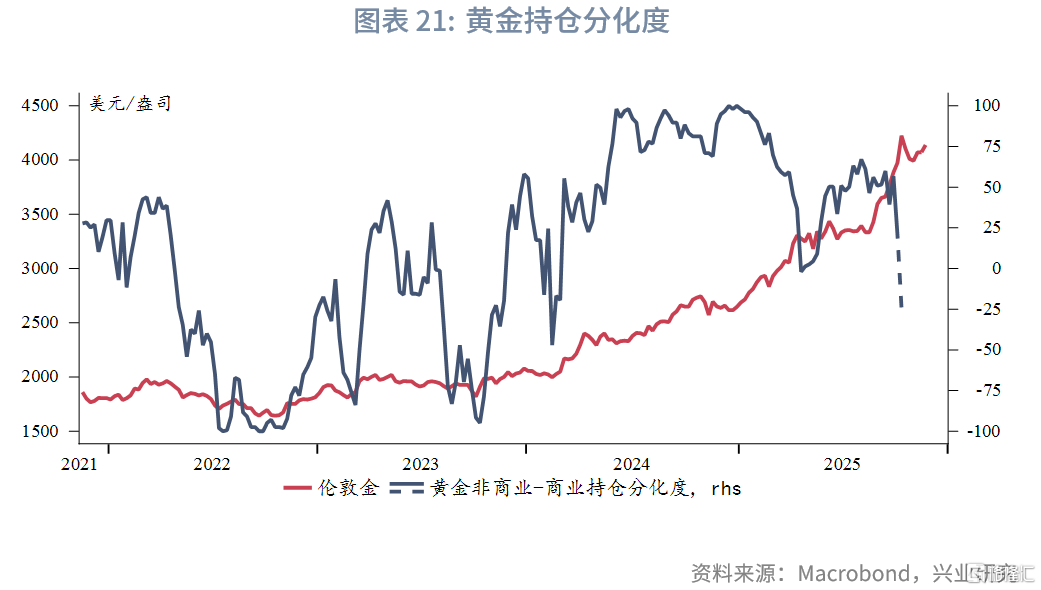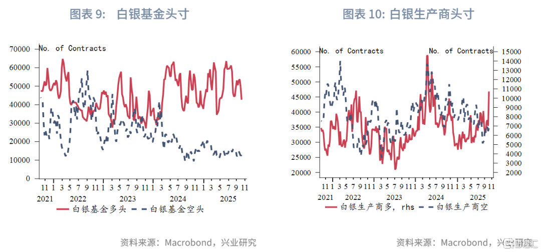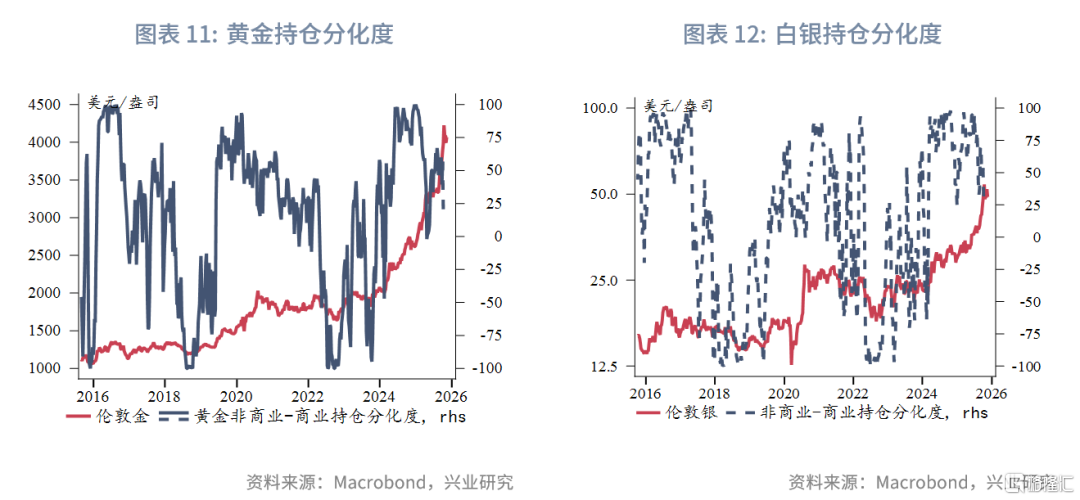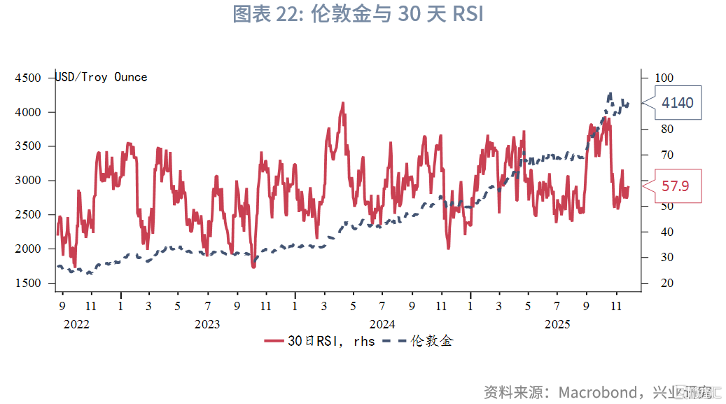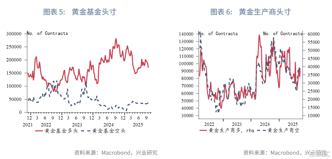 10月末至11月中旬,黄金多次向下试探3900至4000美元/盎司,特别是在11月中比特币跌破10万美元大关带来的抛售潮中黄金依然稳守4000美元/盎司关口,表明下方承接盘较强或者是在4000美元/盎司之下多头减仓意愿明显下降。