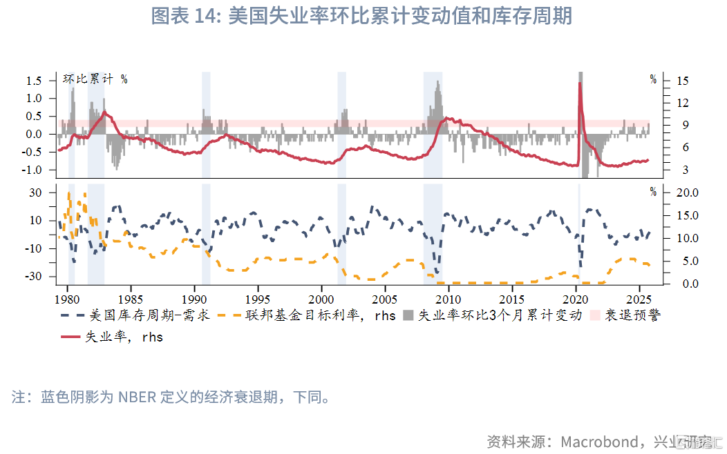 失业率是美联储的唯一官方就业市场指标。虽然失业率在周期尾部的突变往往难以捕捉,但如果将失业率转换为环比变动值并计算其3个月滚动累计值,可以发现在1980年以来的经济复苏期的大部分时间,失业率环比累计变动值为负。当失业率环比累计变动值达到0.2%~0.4%,可以视为经济放缓的预警信号。此时往往对应着一轮库存周期的尾部,美联储也会采取预防性的降息措施。1980年以来,当失业率环比累计变动值超过0.4%,无一例外均对应着美国经济衰退。2003年10月失业率环比累计变动值曾触及0.4%,对应着本轮复苏期第一库存周期尾部,此后逐渐回落。今年9月读数升至0.3%,再次进入预警区间,与当前库存周期进入主动去库存吻合。