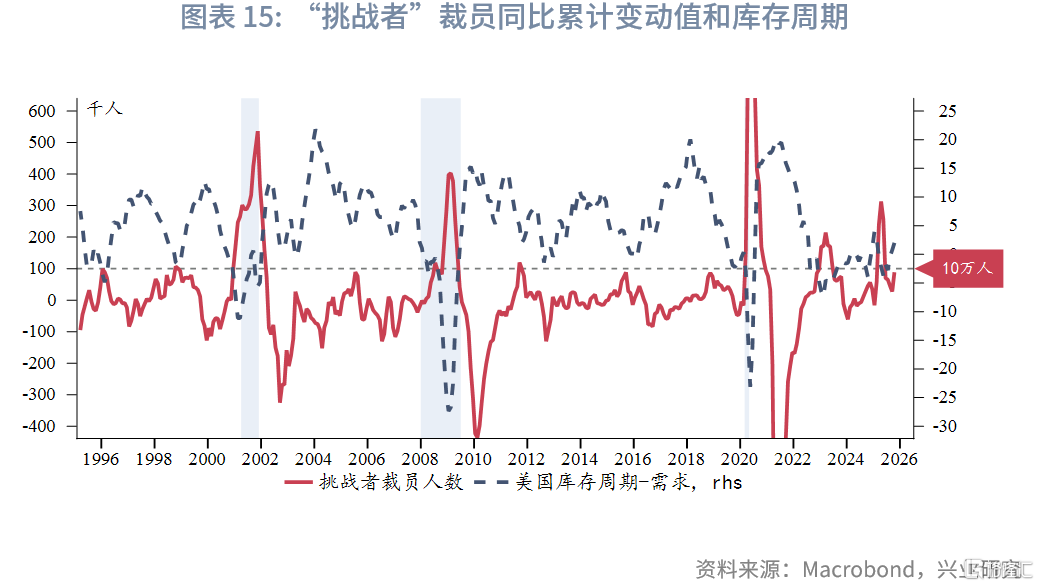 “挑战者”调查的裁员人数和失业率也有较强相关性,并且在近期官方数据延迟公布的情况下能够提供有效的信息补充。和失业率类似,裁员人数通常也会在周期尾部出现突变。由于裁员具有一定季节性特征,我们将裁员人数转换为同比变动并计算3个月滚动累计值。不难发现,裁员人数同比累计值和库存周期需求呈反比,即在库存周期尾部裁员人数通常增加。1996年至2020年期间,未触发衰退的库存周期尾部的裁员人数通常不超过10万人,不过2020年后劳动力市场供需波动加大,2023年上半年和今年上半年均出现了超过10万人的情况。最新的10月数据回升至8.8万人以上。