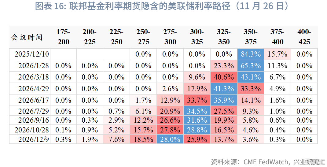 市场降息预期在11月经历了一番波折后,重新回到预期12月降息25bp。预期明年还有约3次降息,不过当前定价程度不高。若未来经济数据验证下行压力加大,则降息预期还有较大的上行空间。
