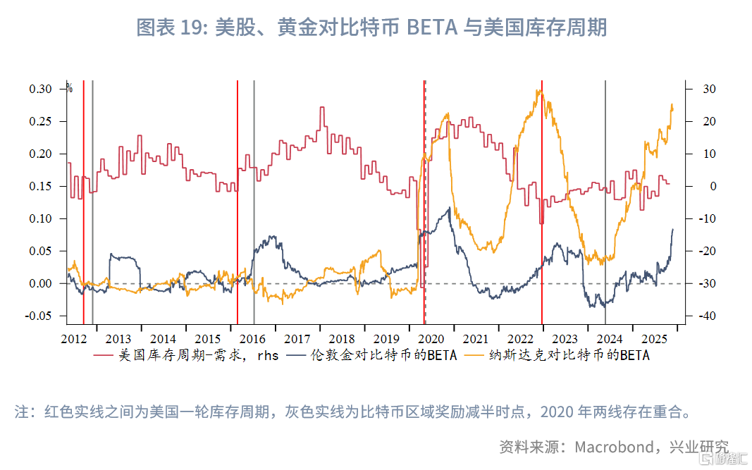 总体看,美股和黄金相较于比特币的BETA虽然绝对中枢水平不同,但2020年以来两者对比特币的BETA均在库存周期开始和结束前后处于相对高位,而在库存周期中段回落至低位。2026年上半年美国本轮第二库存周期临近尾声,美股和黄金相较于比特币的BETA绝对水平或仍将在高位维持一段时间,但当前BETA的绝对数值已处高位,后续回落的可能性大于继续回升的可能性,这也就意味着比特币四年周期波动中上行周期结束转为下行,未来的抛售在短期仍会影响市场整体情绪,但随着时间推演,加密货币的波动在库存周期中段或更局限于自身市场,对于美股和黄金影响或相对下降。