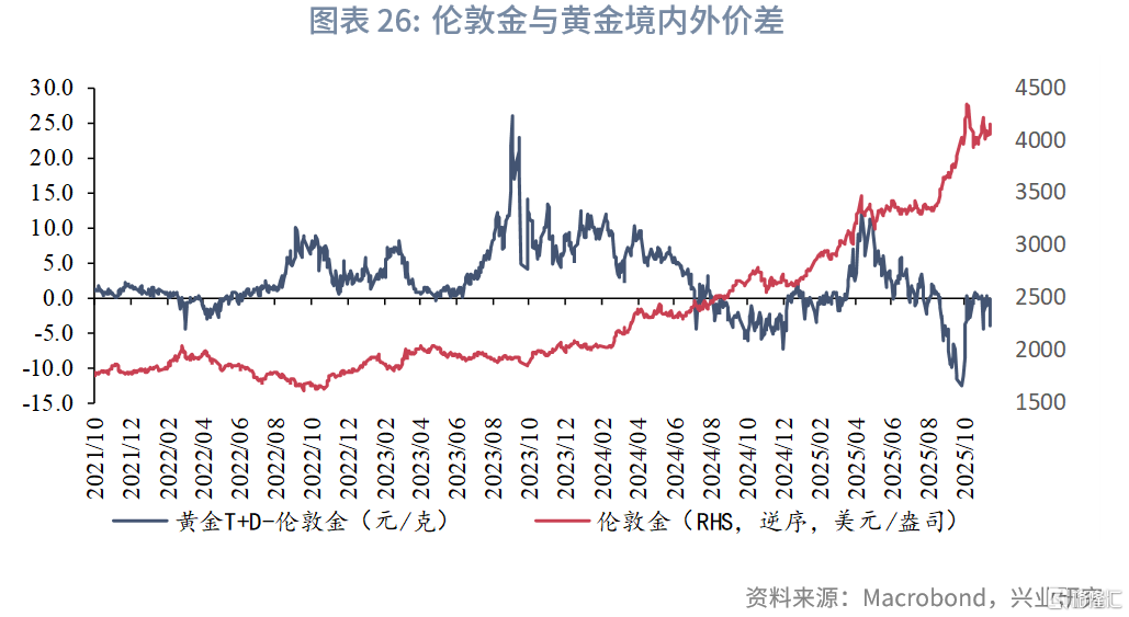 比价方面,2025年11月金银比回落。价差方面,11月境内外价差围绕0值波动。