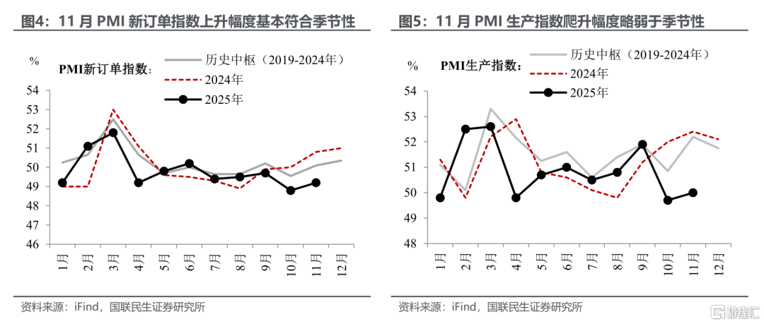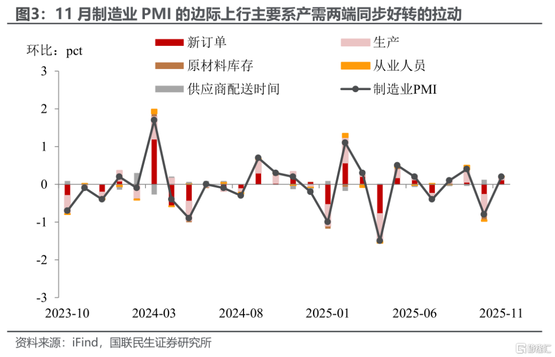 产需两端同步边际好转,但“需”更胜于“产”。11月制造业PMI的主要拉动项目,为细项数据中占比最大的PMI新订单指数及PMI生产指数。前者上升0.4pct、录得49.2%;后者上升0.3pct、录得50.0%