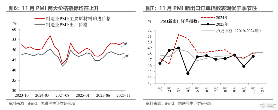 价格指标继续释放来自“反内卷”的积极信号。11月两大PMI价格指标均传达出积极信号,其中PMI原材料购进价格指数上升1.1pct、录得53.6%PMI出厂价格指数上升0.7pct、录得48.2%指向PPI整体增速具备继续改善的可能性。不过上游价格改善力度大于下游,意味着企业利润空间或正在收窄。