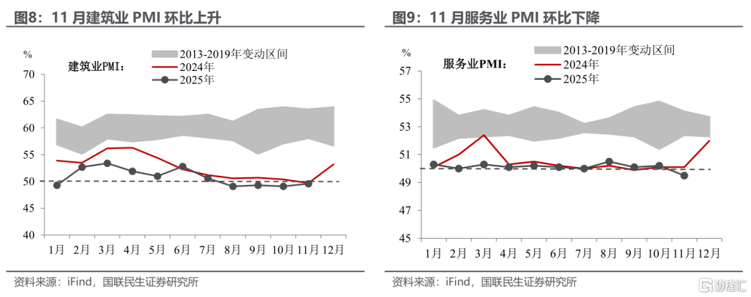 新型政策性金融工具为建筑业“加持”,而服务业更需“加一把火”。11月建筑业PMI告别6月以来的整体下行区间,环比上升0.5pct49.6%,这也是6月以来建筑业PMI的最大增幅。不仅反映了新增专项债逐步投向实物工作量后的政策见效,更是反映了新型政策性金融工具的落地效果相较之下,环比下降0.7pct、达到历史同期较低位置的服务业PMI略显逊色,后续亟需以更大力度推动服务消费机制的完善。
