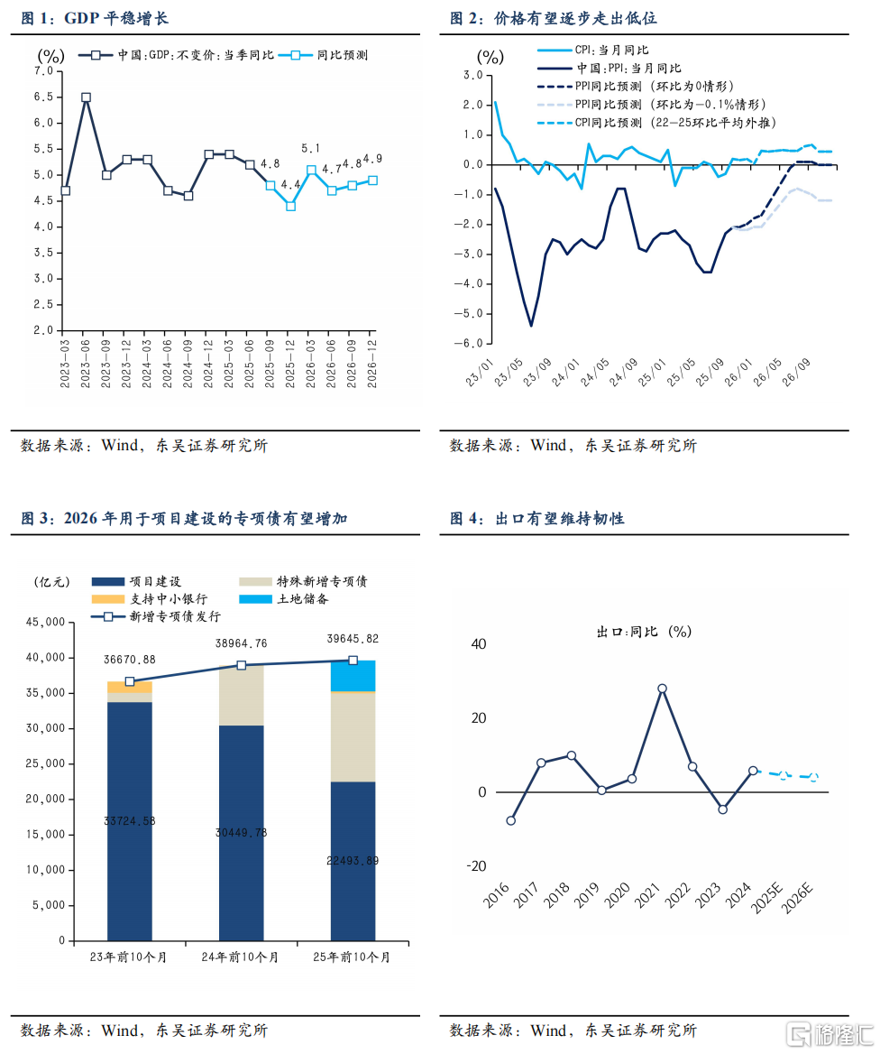 我们在《中国经济接力赛——2026年度展望:中国经济》报告中对2026年的中国宏观经济各方向做出了预测,我们预计,2026年,中国经济大概率将维持平稳增长态势。为实现2035年“人均国内生产总值达到中等发达国家水平”的目标,“十五五”前两年仍有必要维持5%左右的经济增速,2026年增速或为4.9%。分项来看,投资端可能回升,“十五五”开年项目储备充足,资金面改善将推动广义基建投资提速;制造业投资预计维持在6%;房地产投资受控于去库存政策降幅收窄。消费增长取决于补贴政策力度,若能加大补贴范围,消费有望获支撑。出口方面,新兴市场和欧洲的贡献相对稳定的情况下,2026年,出口的增量有望来自于美国趋于宽松的货币财政政策带动的需求支撑。
