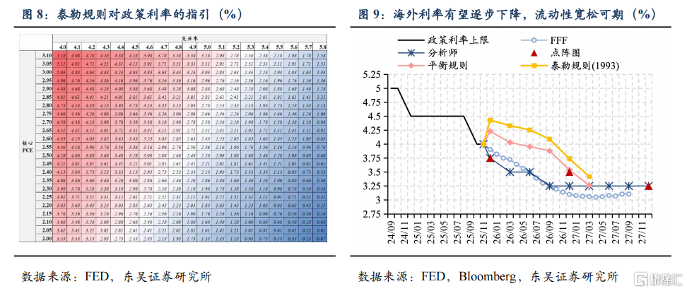 海外流动性来看,根据特朗普的政策主张及美联储主席换届落地,我们预计2026年5月美联储新主席上任后,Fed Put将替代TACO对冲关税冲击,2025年底至2026年底美联储或开启4次降息,全球流动性宽松周期将至。本次流动性宽松不如2020年挽救冲击时的急迫,大概率市场会进行提前交易,但降息通道开启有可能带来更低的利率与更糟的信用,对美元体系的冲击更大,流动性从美向非美地区的转移有可能更甚从前。