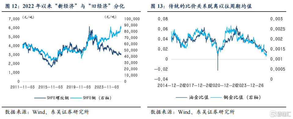 向“新经济”结构转型推升“绿通胀”核心商品。在2022年全球经济走向“疫后复苏”阶段后,经济增长就呈现结构性的“K型”复苏态势,映射至大宗商品市场,也表征为AI算力、芯片和绿色电力等“新经济”繁荣带动新增需求,推动铜、铝等有色商品迭创新高,以及房地产、低端制造等“旧经济”需求持续低迷,钢材和原油等商品价格中枢逐级下行,经济增长动能的系统性结构变化深刻影响大宗商品供需结构,这种由于全球经济持续推进绿色转型,新能源等低碳经济板块带动的铜和铝等商品价格上涨被称之为“绿色通胀”。我们认为,“十五五”规划期间乃至未来,中国经济增长模式从地产和传统基建转向“新质生产力”仍是重要趋势,高质量发展人工智能、新能源、机器人、芯片等“新经济”活跃程度将持续高于钢铁、建筑建材等“旧经济”,需求结构变化将继续主导大宗商品市场的温度,铜和铝等受益于AI算力、新能源等新兴产业发展的大宗商品价格上涨,更具长期性和确定性,需求增量和供给紧缺形成的“短缺叙事”,或在2026年至2027年继续冲击价格和情绪,有色金属作为“绿通胀”核心标的,或继续迎来多头配置机遇。
