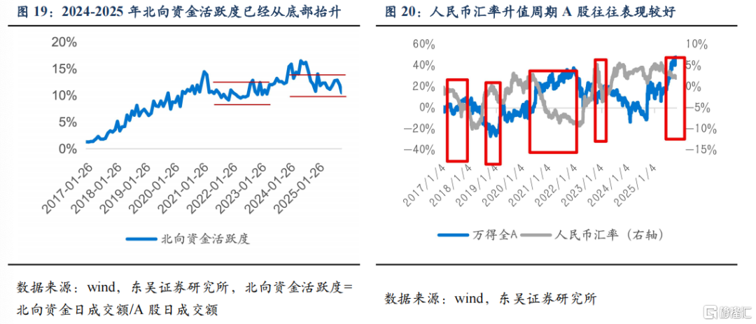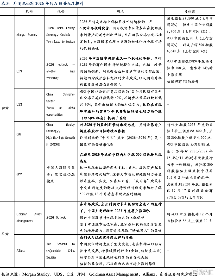2025年A股持续慢牛的过程中,市场已经吸纳了一部分交易型外资回归,外资活跃度已经较2022-2023年底部区域有所抬升。在美联储延续“降息”周期、美元指数维持结构性弱势等海外因素的作用下,随着中美关系阶段性缓和,美元指数由强转弱,在欧元等非美货币升值浪潮下,人民币对美元有望在2026年开启渐进升值之路,加之配置机构在四季度决策期和观察期布局下一年资金配置,外资买方、卖方给出了A股及港股的新目标价,表示外资对中国市场的关注度提升,2026年的A股有望迎来更多外资的回归。