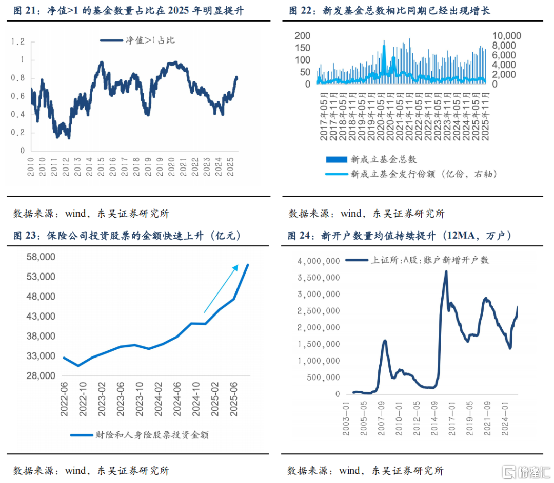 国内机构来看,今年以来,随着市场结构性行情的上涨,前期经历亏损的基金已经大部分回到净值1以上,而高点突破后市场的持续上行、基民拥有了足够的安全垫后,下一步公募基金的销售有望再上新台阶。因此,基金净值翻倍、12月年末业绩统计结束后,2026年会有更多的居民观察到公募基金收益的上行,将有望提升公募产品发行速率,向市场引入更多专业化的源头活水。保险资金方面,在《关于推动中长期资金入市的指导意见》的推动下,保险资金入市进程加快。2024 年下半年起保险公司股票投资金额快速上升,2025 年二季度末保险资金运用余额达36.2万亿元,股票和证券投资基金配置规模4.7万亿元,占比已达13%。2026 年在既定的新增保费投资于权益市场的比例要求下,保险资金投资A股的规模有望进一步提升。