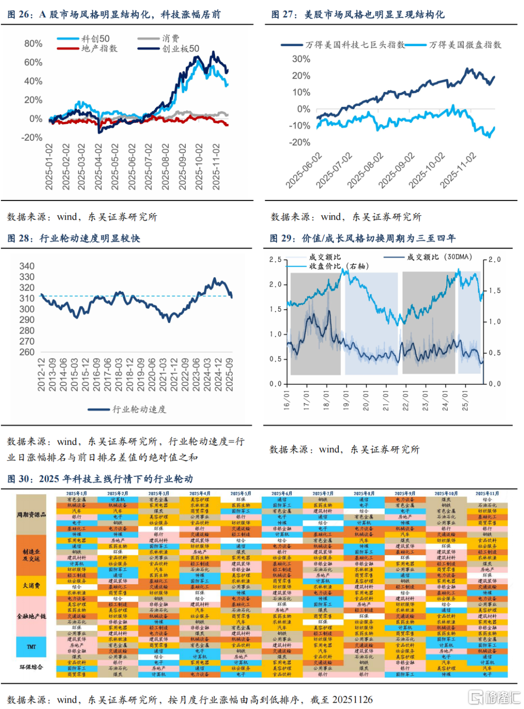 横向比较市场的估值,当前A股估值与美股几乎持平。截至2025年11月25日,上证指数估值从历史96%分位略下降至87.4%,与标普500指数、道琼斯指数相当,沪深300、万得全A略低于美股主要指数。代表科技产业的科创50估值分位已经超过纳斯达克指数。在业绩迎来释放期之前,短期A股部分板块估值偏高,业绩真空期内仍需要消化部分板块的估值。在业绩释放、估值与业绩逐步匹配后,市场有望在年报披露完毕后再迎来新一轮的估值业绩平衡。