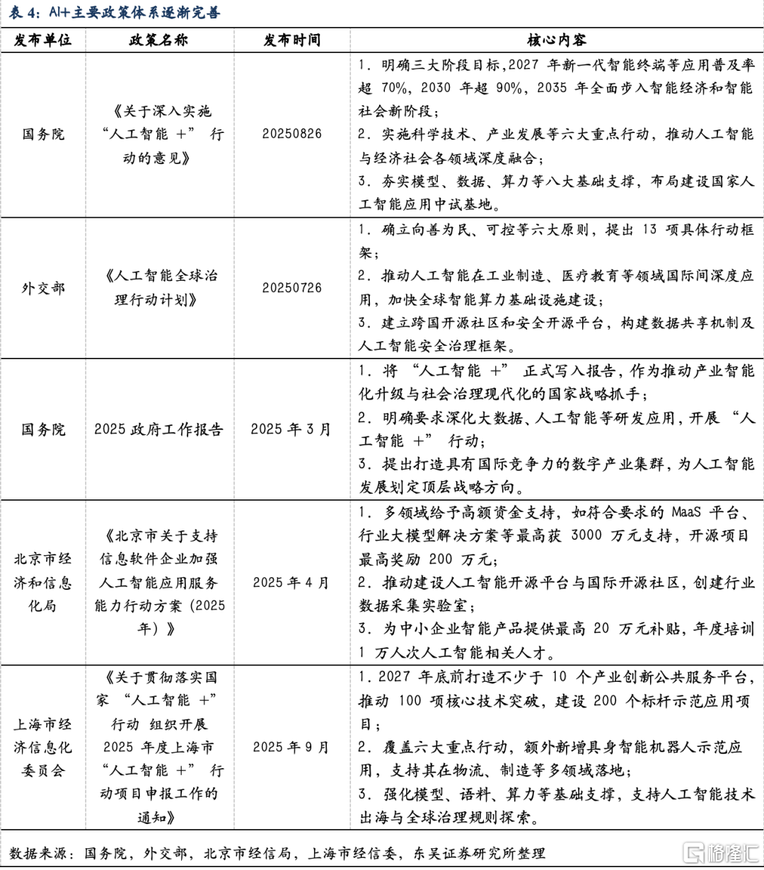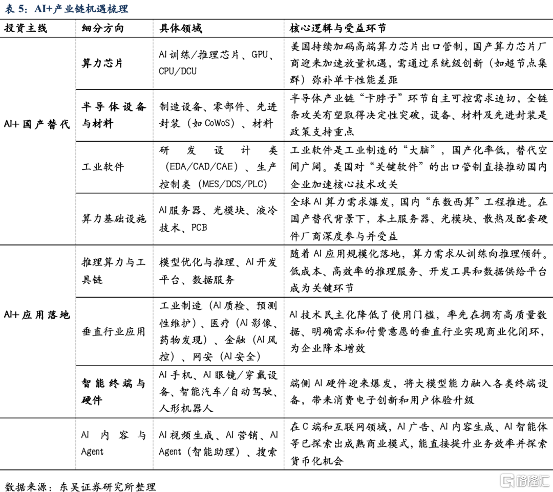 尽管AI产业趋势呈现全球节奏同步性,整体科技板块的上涨节奏也更多依靠海外AI产业链的映射,但2026年以及更长维度来看,中美科技博弈仍将倒逼国内 AI 产业链国产替代加速。“十五五”规划强调科技自立自强,当前中国AI产业政策已经形成了完整体系:《“十四五”数字经济发展规划》(2021年总纲)、《“人工智能 ”行动意见》(2025年行动纲领)、《人工智能融合发展行动计划(2025-2028)》(专项计划)及千亿元人工智能创新发展基金(配套机制)共同构成支撑。地方政府积极响应,上海建成全球规模最大城市级5G网络,成都设立“AI应用中试基地”,推动技术向重点行业渗透。集成电路、基础软件等领域获政策重点支持,叠加国内互联网厂商 AI 投入意愿提升,国内AI 产业链从算力硬件到应用端将全面受益。