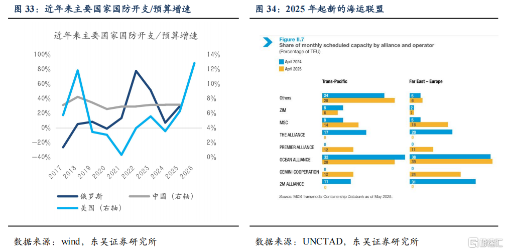 除军备外,全球走向双极化的大背景下,供应链自主可控成为各国战略重点,航运与物流作为供应链的核心环节,在保障物资运输、降低供应链中断风险中作用关键。全球供应链重构推动航运物流从成本中心转向战略资产。2026 年,海外来看,中企全球化进程加快,全球营收敞口企业增多,推动航运物流需求提升;国内来看,国防领域的战略物资与装备生产、运输也将进一步带动供应链全链条发展。
