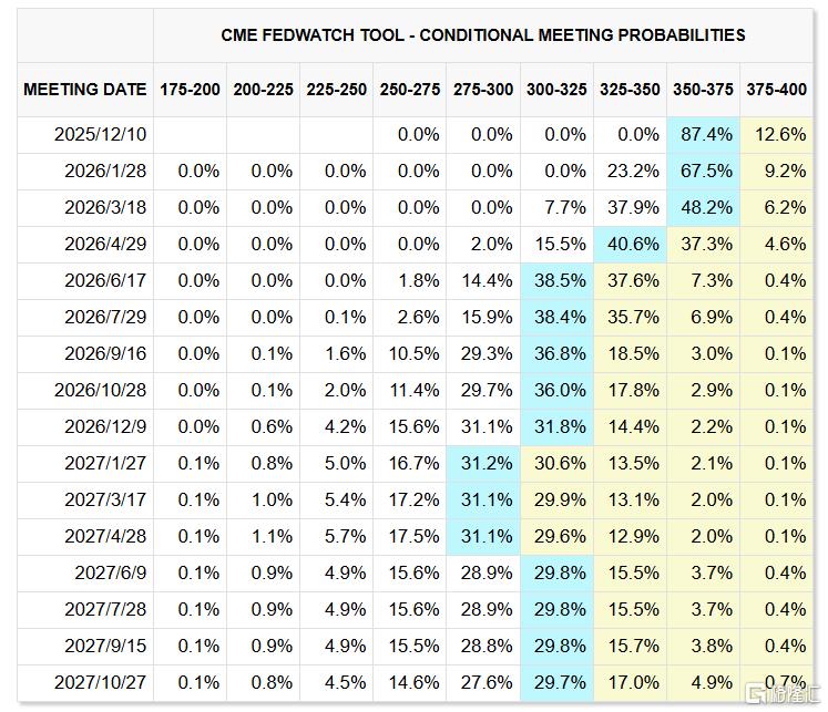 据CME“美联储观察”:美联储12月降息25个基点的概率为87.4%,维持利率不变的概率为12.6%。美联储到明年1月累计降息25个基点的概率为67.5%,维持利率不变的概率为9.2%,累计降息50个基点的概率为23.2%。