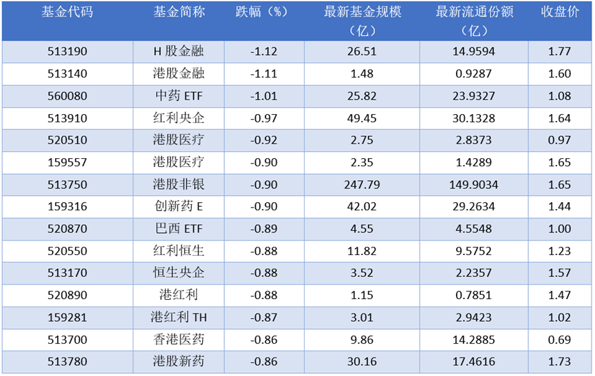 下跌方面,2025年11月28日跌幅最大的是H股金融 (513190),跌幅达到1.12%。排名靠前的港股金融(513140)、中药ETF(560080)、红利央企(513910),跌幅分别为1.11%、1.01%、0.97%。
