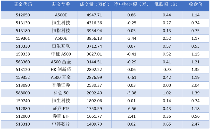 从成交量上来看,2025年11月28日成交量最大的是A500ETF(512050),成交量为4947.71万份。排名靠前的恒生科技(513130)、恒指科技(513180)、A500ETF(159361),成交量分别为4316.36万份、3954.94万份、3856.13万份。