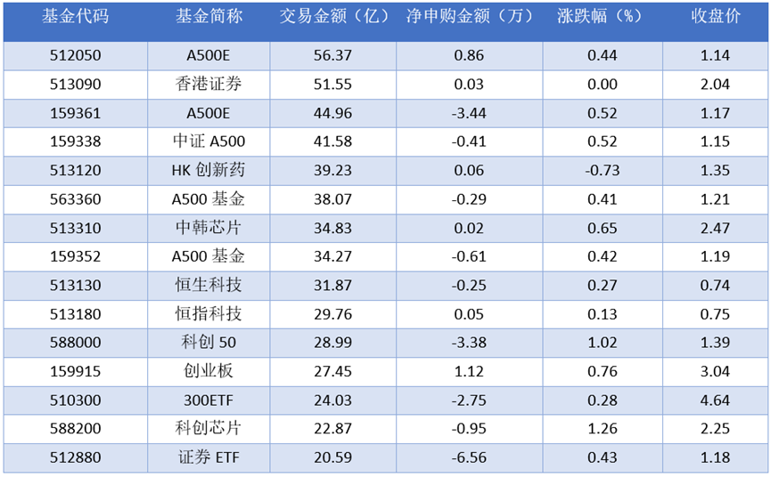 从成交金额上来看,2025年11月28日成交额最大的是A500ETF(512050),交易金额56.37亿元。排名靠前的香港证券(513090)、A500ETF(159361)、中证A500(159338),成交额分别为51.55亿元、44.96亿元、41.58亿元。