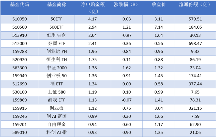 细分到资金流动情况上来看,2025年11月28日净申购金额最大的为50ETF(510050),当日净申购金额为4.17亿元。排名靠前的500ETF(510500)、红利央企(513910)、券商ETF (512000),申购金额为2.94亿元、2.64亿元、2.41亿元。