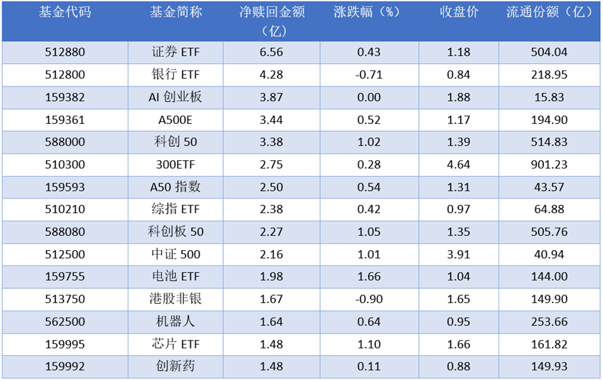 资金流出方面,2025年11月28日净赎回金额最多的是证券ETF(512880),赎回金额6.56亿元。排名靠前的银行ETF(512800)、AI创业板(159382)、A500ETF(159361),赎回金额分别为4.28亿元、3.87亿元、3.44亿元。