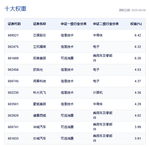 数据显示,截至2025年9月9日,中证智能汽车主题指数(930721)前十大权重股分别为芯原股份、立讯精密、拓普集团、欧菲光、闻泰科技、科大讯飞、豪威集团、德赛西威、华域汽车、长城汽车,前十大权重股合计占比48.47%。