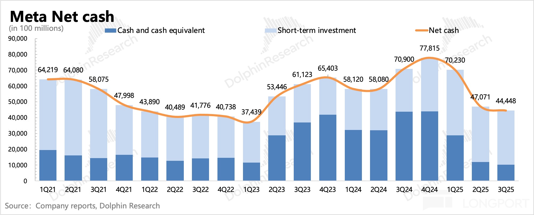 而去年下半年以来持续上升的 Capex 资金流出,导致 Meta 账上现金急剧缩水。截至 Q3 末,现金 短期投资(可售证券为主)余额只剩 440 亿美金,相比去年同期直接少了近 40% 。