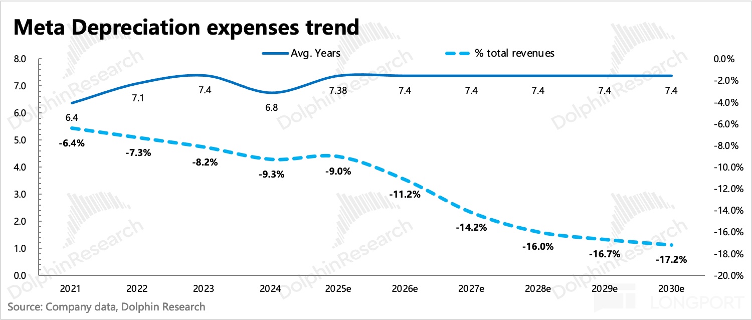 上述折旧费用对利润率滑坡的影响,会在 2027 年达到巅峰,一年掉 3 个点,2028 年之后才会逐步缓和。超预期的可能,一个是算力成本大降,一个则是靠 Meta 在经营费用上做更多让步,比如优化人员等等,利润率滑坡有望比海豚君的预期提前触底,但显然前者的效果更加事半功倍。